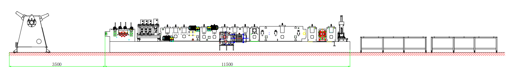 Dérouleur → Dispositif d'alimentation et de nivellement → Dispositif hydraulique de prédécoupe et de poinçonnage → Système de profilage → Postdécoupe hydraulique → Rack de sortie